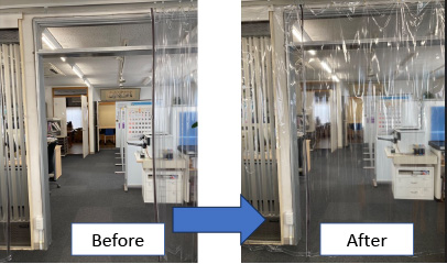 そこで弊社では「透明なビニールカーテン」で要所毎に仕切れるようにしました。